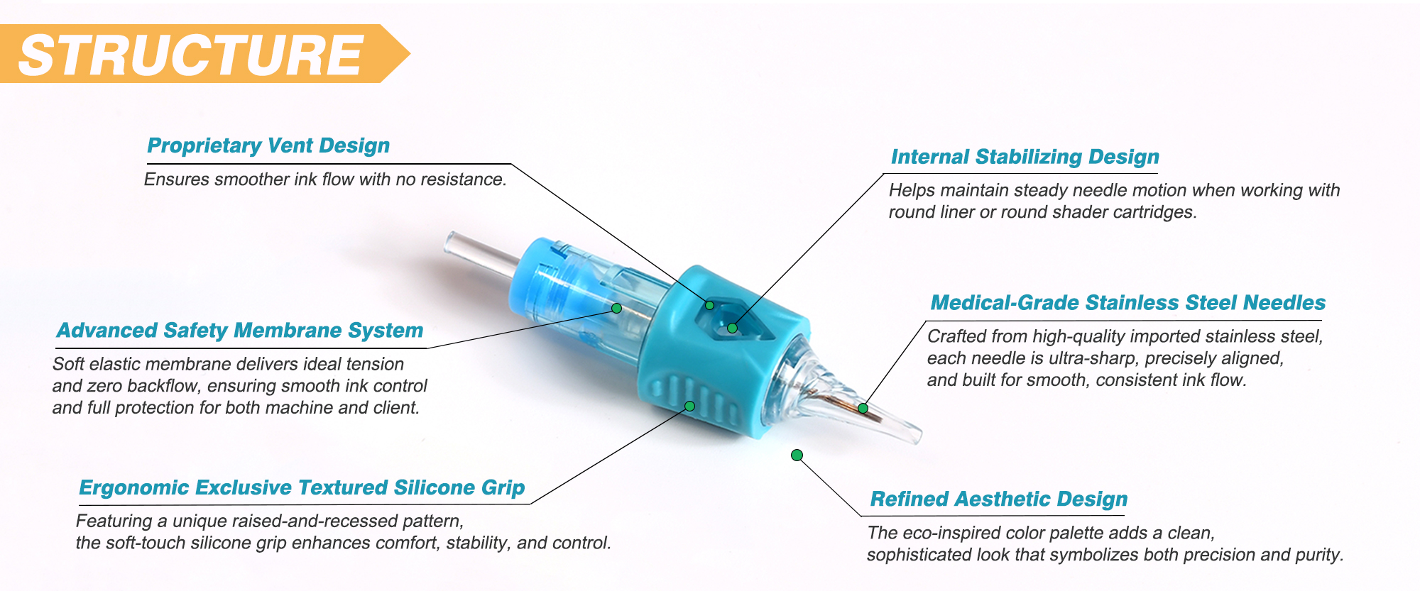 The semi-transparent shell allows real-time visibility of ink flow and needle movement. Reinforced inner structure ensures precise fixation, minimized vibration, and consistent performance. The eco-inspired color palette adds a clean, sophisticated look that symbolizes both precision and purity.