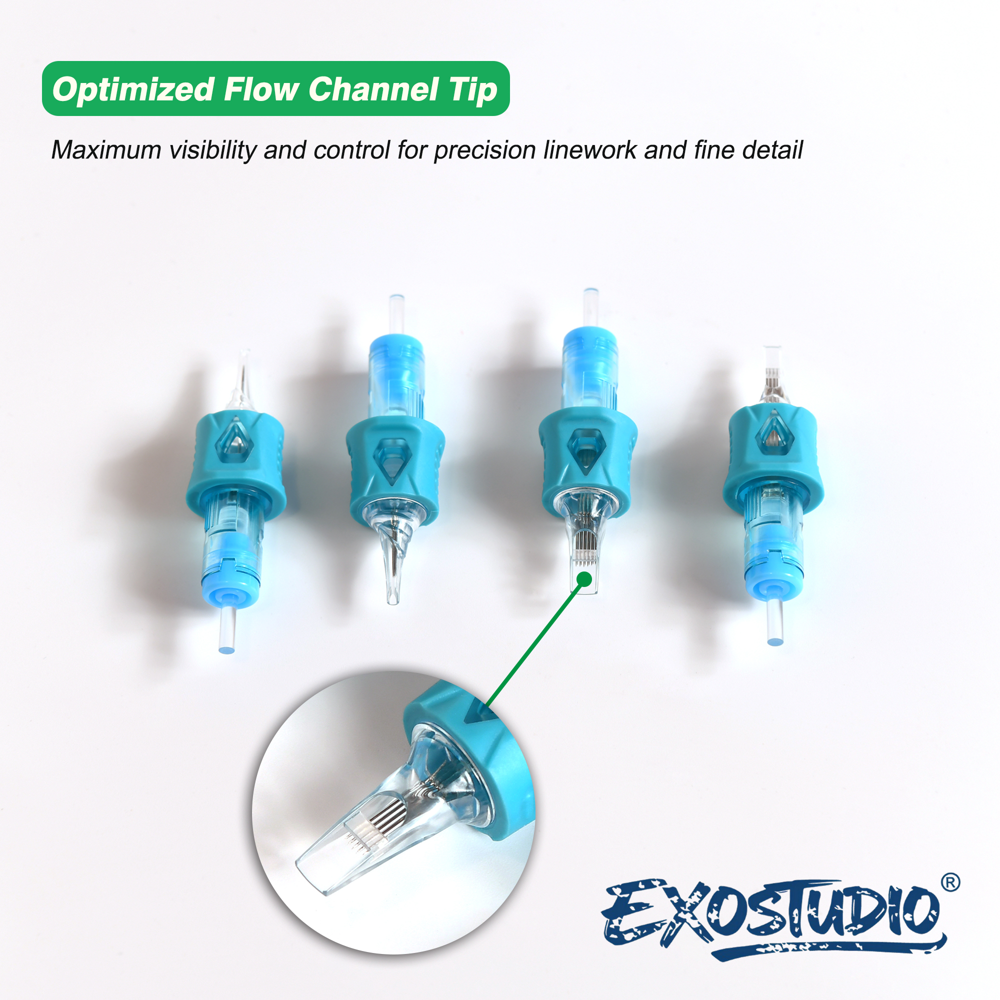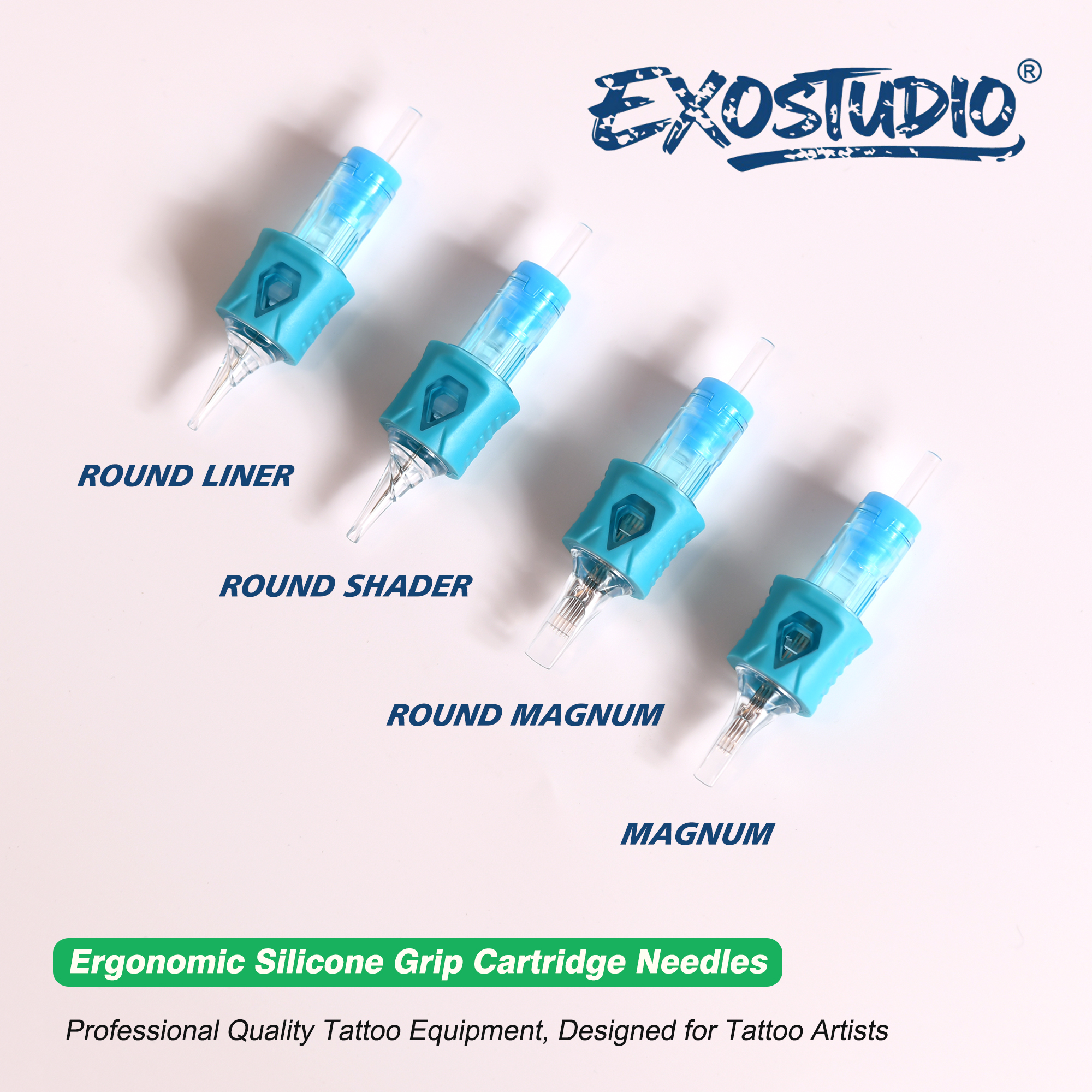 Developed by EXOSTUDIO® for professional tattoo artists, these premium cartridge needles combine precision engineering, ergonomic comfort, and an eco-inspired modern aesthetic. Every detail—from the color choice to the grip texture—reflects our commitment to functionality, safety, and refined design.